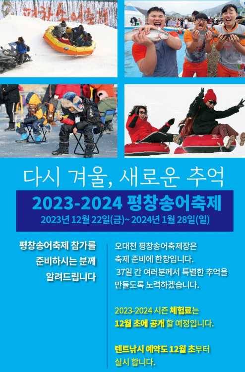 축제는 2023년 12월 22일부터 2024년 01월 28일까지 평창군 진부면 경강로 3562에서 열립니다. 오대천은 한강의 최상류로, 맑고 깨끗한 1급 청정수가 얼음 아래 송어의 특별한 느낌을 더해줍니다.