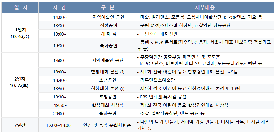 축제 첫날에는 지역예술인들의 사전공연부터 시작하여 K-POP 콘서트가 열리며 두 번째 날에는 전국 어린이 합창대회 본선회와 소향 가수의 공연 등 다양한 이벤트가 계속됩니다.